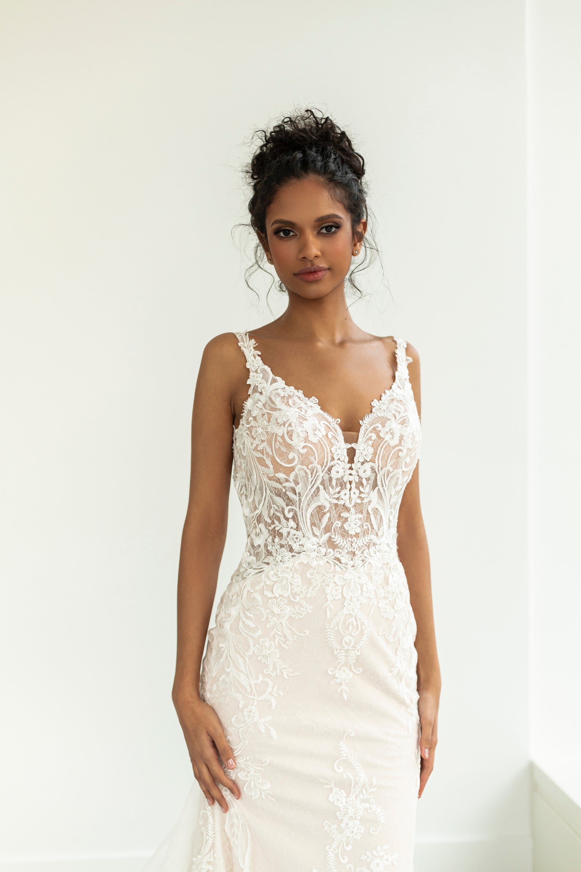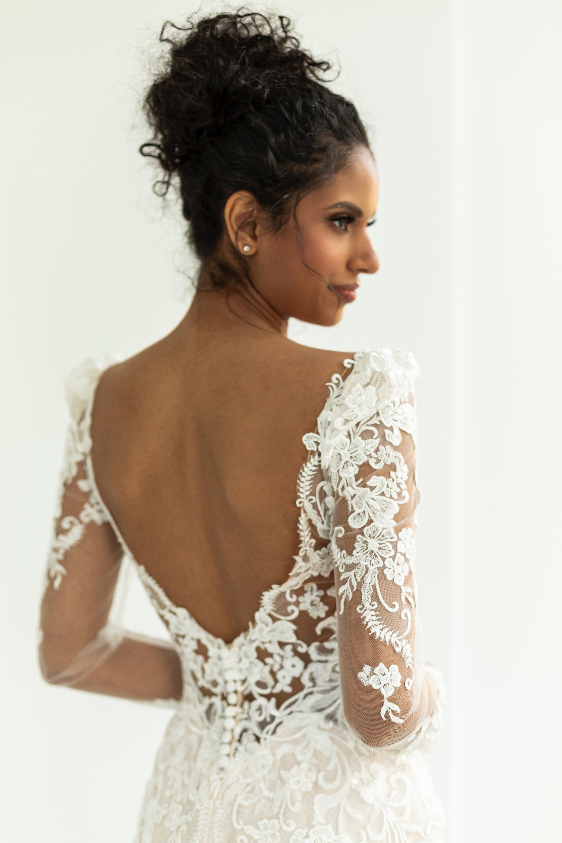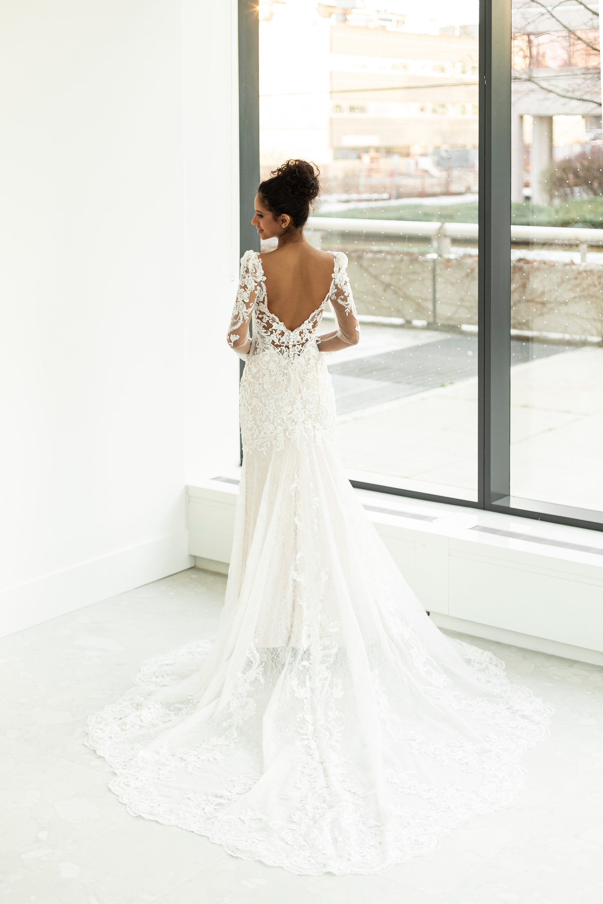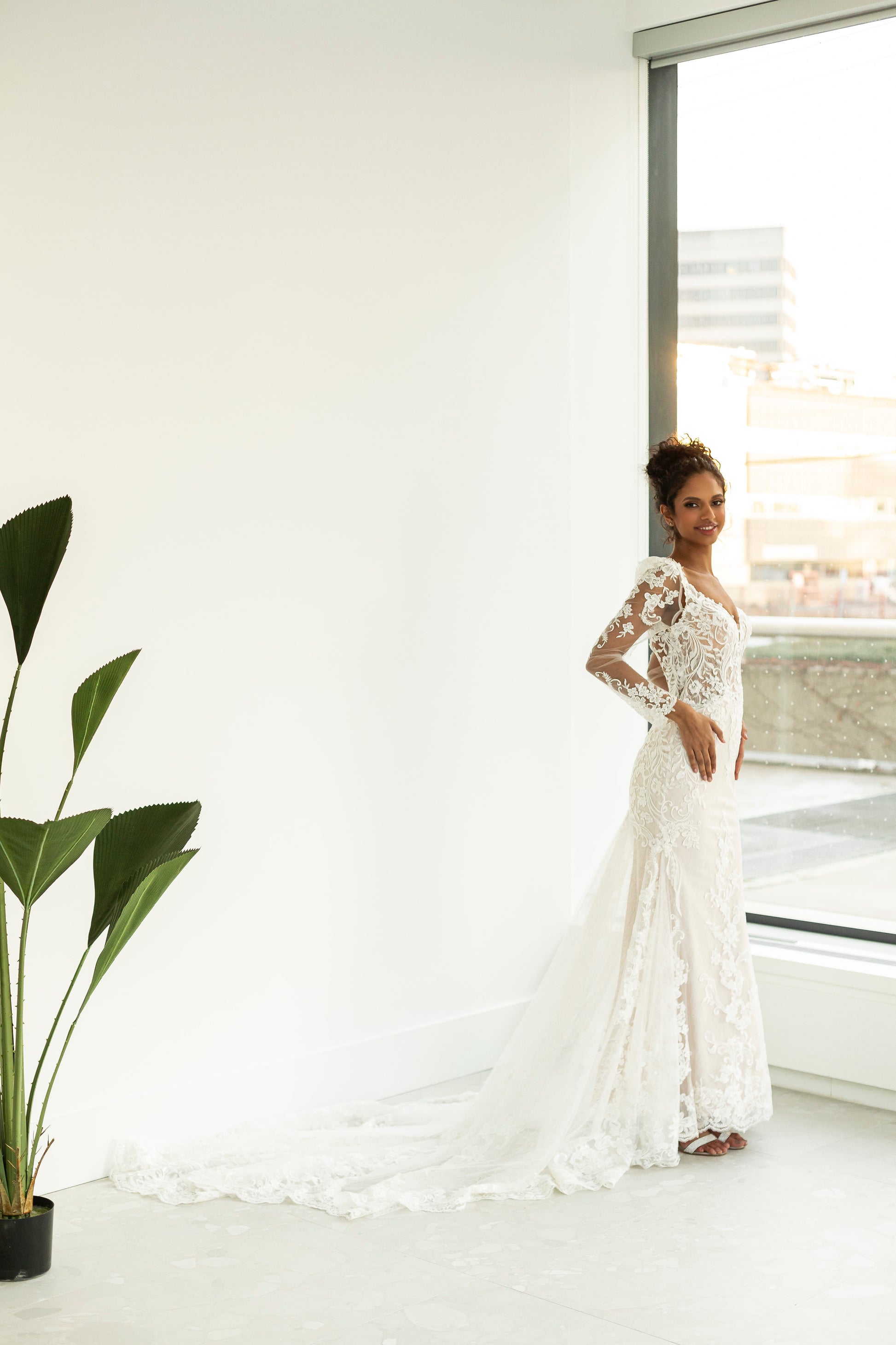 This stunning Tea dress is the perfect choice for your wedding day. Crafted from delicate lace, this fit and flare silhouette features a low V-neckline, a structured long train, and detachable long sleeves for a versatile look. The lace is draped throughout the dress to create a romantic, feminine look that will take your breath away. You will feel beautiful and timeless in this gorgeous gown.